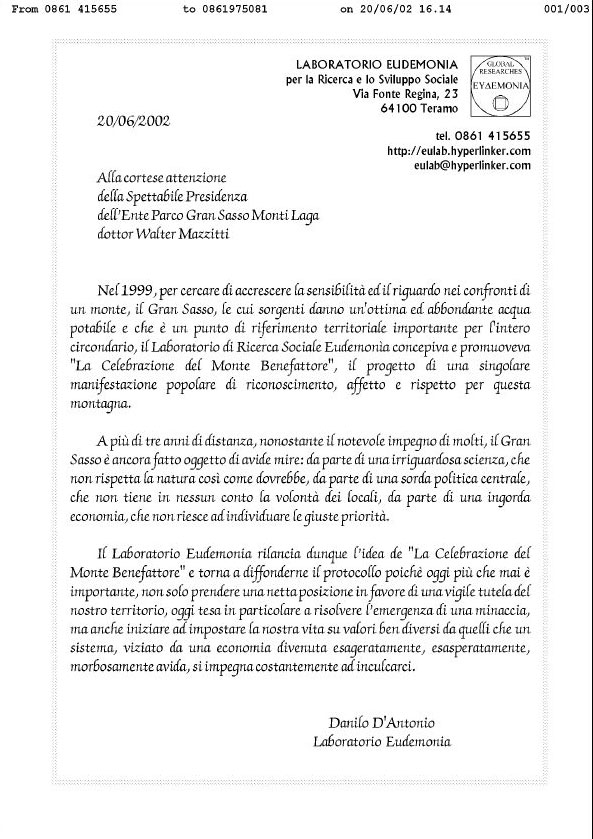 Indirizzato alla Presidenza, nel frattempo mutata, del Parco, quest'ultimo istituì in gran pompa, senza però più citare e tantomeno ringraziare lo scrivente, una propria giornata dell'anno dedicata al monte più alto dell'Appennino. Buon per il Gran Sasso: missione riuscita!