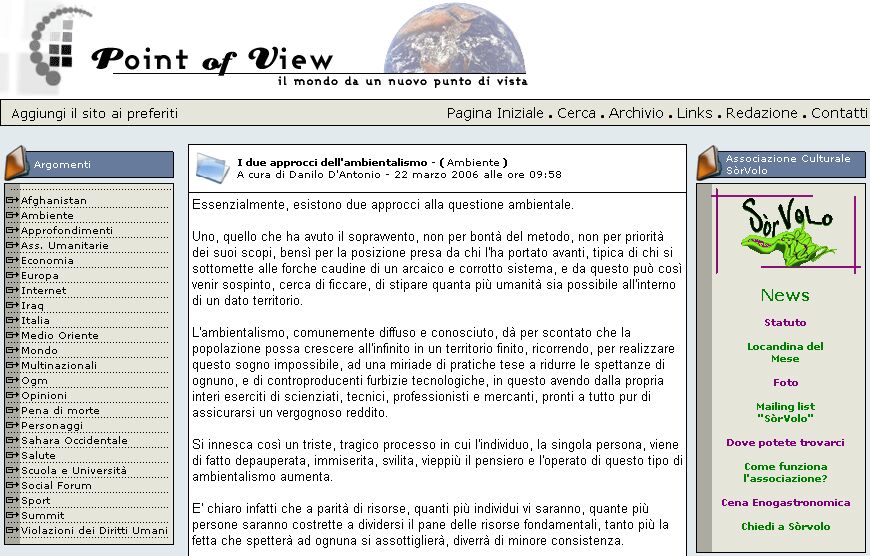 Campagna avviata il 19/03/37: foto Essenzialmente esistono due approcci alla questione ambientale. Uno, quello che ha avuto il sopravvento, non per bontà del metodo, non per priorità dei suoi scopi, bensì per la posizione presa da chi l'ha portato avanti, tipica di chi si sottomette alle forche caudine di un arcaico e corrotto sistema, e da questo può così venir sospinto, cerca di ficcare, di stipare quanta più umanità sia possibile all'interno di un dato territorio. L'ambientalismo, comunemente diffuso e conosciuto, dà per scontato che la popolazione possa crescere all'infinito in un territorio finito, ricorrendo, per realizzare questo sogno impossibile, ad una miriade di pratiche tese a ridurre le spettanze di ognuno, e di controproducenti furbizie tecnologiche, in questo avendo dalla propria interi eserciti di scienziati, tecnici, professionisti e mercanti, pronti a tutto pur di assicurarsi un vergognoso reddito. Si innesca così un triste, tragico processo in cui l'individuo, la singola persona, viene di fatto depauperata, immiserita, svilita, vieppiù il pensiero e l'operato di questo tipo di ambientalismo aumenta. E' chiaro infatti che a parità di risorse, quanti più individui vi saranno, quante più persone saranno costrette a dividersi il pane delle risorse fondamentali, tanto più la fetta che spetterà ad ognuna si assottiglierà, diverrà di minore consistenza. Per l'insieme di tali motivi, definiamo "meschino" questo tipo di ambientalismo. Esiste, per nostra fortuna, un altro tipo di approccio alla questione ambientale, approccio che definiamo subito "prospero", perché rende ognuno felice e soddisfatto: introducendo nuovi concetti come quello della "densità demografica ottimale" o quello dei "patti di autocontenimento alla crescita", suggerendo quindi innanzitutto di limitare le nascite e quindi mitigando anche l'economia, permette ad ogni individuo di vivere una vita degna, ricca, gioiosa, prospera appunto, una vita che, pur rifuggendo da sprechi irresponsabili, tuttavia non lesina ogni ben di natura alla persona. Questo tipo di ambientalismo quanto più opera quanto più ricca e felice rende la persona. L'ambientalismo meschino cerca di far passare l'idea, ed in questo trova fratello il sistema, che una persona abbia bisogno di poco per vivere e, per questo, poco debba essergli concesso. Esso vuol ricoprire il mondo con batterie di anguste gabbie, fisiche e giuridiche, in cui rinchiudere gli umani facendoli vivere come polli d'allevamento. L'ambientalista prospero sa che nella modestia, nella parsimonia e nella semplicità si trovano le chiavi di ogni felicità umana, ma mai sognerebbe di promuovere politiche tese a limitare il fabbisogno dell'individuo. Esso vuol restituire al mondo la sua natura, regalandoci così sterminati verdi territori dove liberare e far correre il nostro desiderio di vivere. L'ambientalismo meschino ritiene di non poter far nulla per arrestare la crescita della popolazione in maniera accettabile dalla popolazione stessa, senza una imposizione di regime, per questo nasconde pavidamente i fatti e la testa sotto la sabbia. L'ambientalismo prospero ritiene invece che, semplicemente dichiarando e facendo conoscere la realtà delle cose, le persone siano da sole in grado di giudicare e cambiare i propri comportamenti, per questo si alza in piedi e dice: ne siamo troppi, che vogliamo fare? Guardiamo le cose da una prospettiva più ampia. Pensiamo un momento all'Universo: pensiamo a Coloro che l'hanno realizzato. Pensiamo a quante energie e risorse hanno dovuto sprecare Costoro prima di riuscire ad ottenere un piccolo ma straordinario pianeta come la Terra. Pensiamoci un attimo: chiudiamo gli occhi, rilassiamoci e visualizziamo la Terra nell'immensità del Cosmo, immersa nelle sue fantasmagoriche, infinite, poderose manifestazioni.