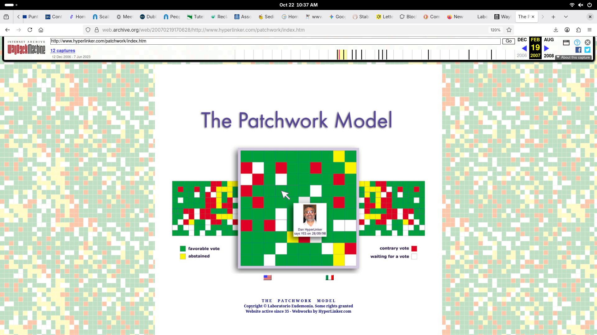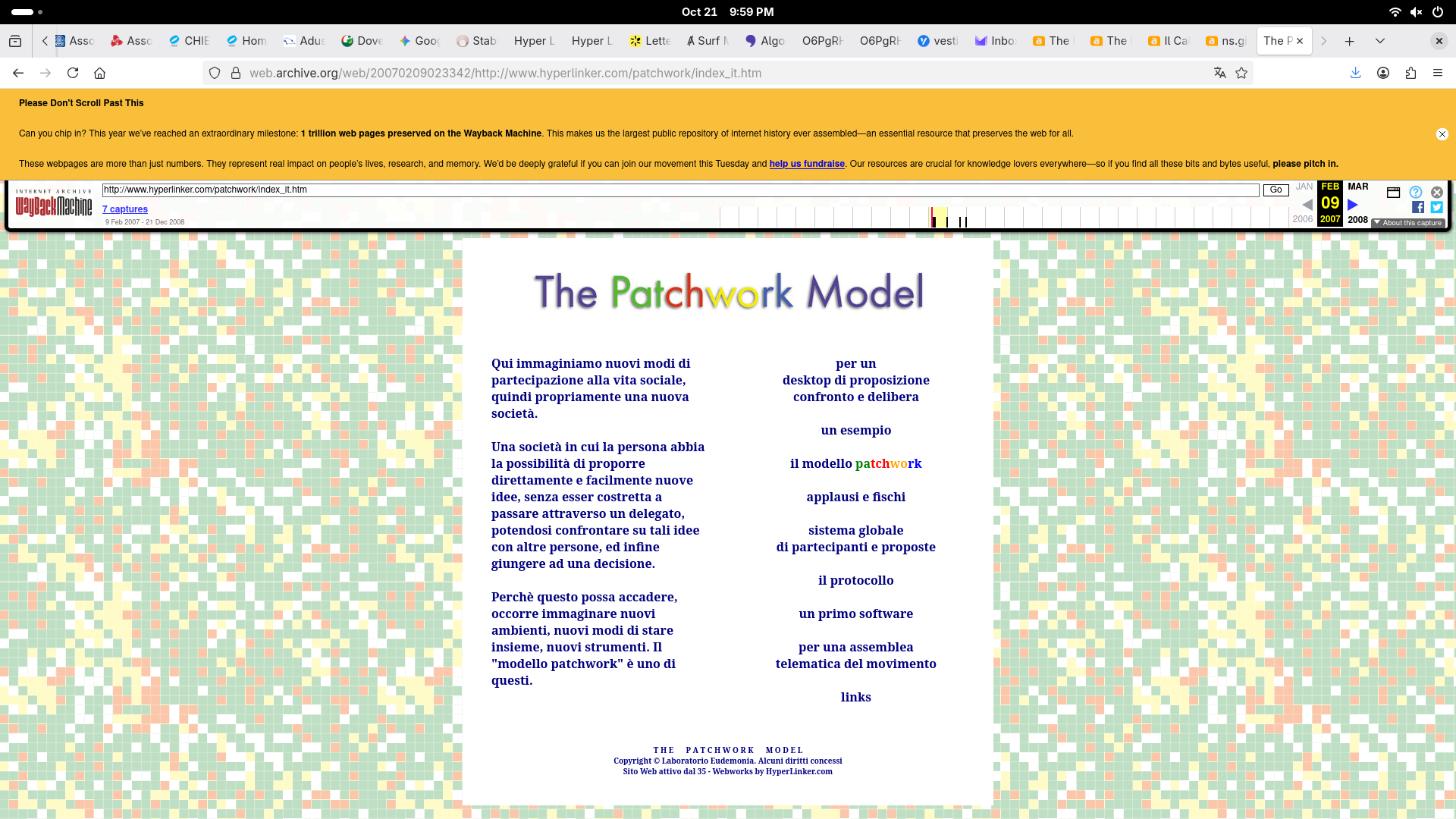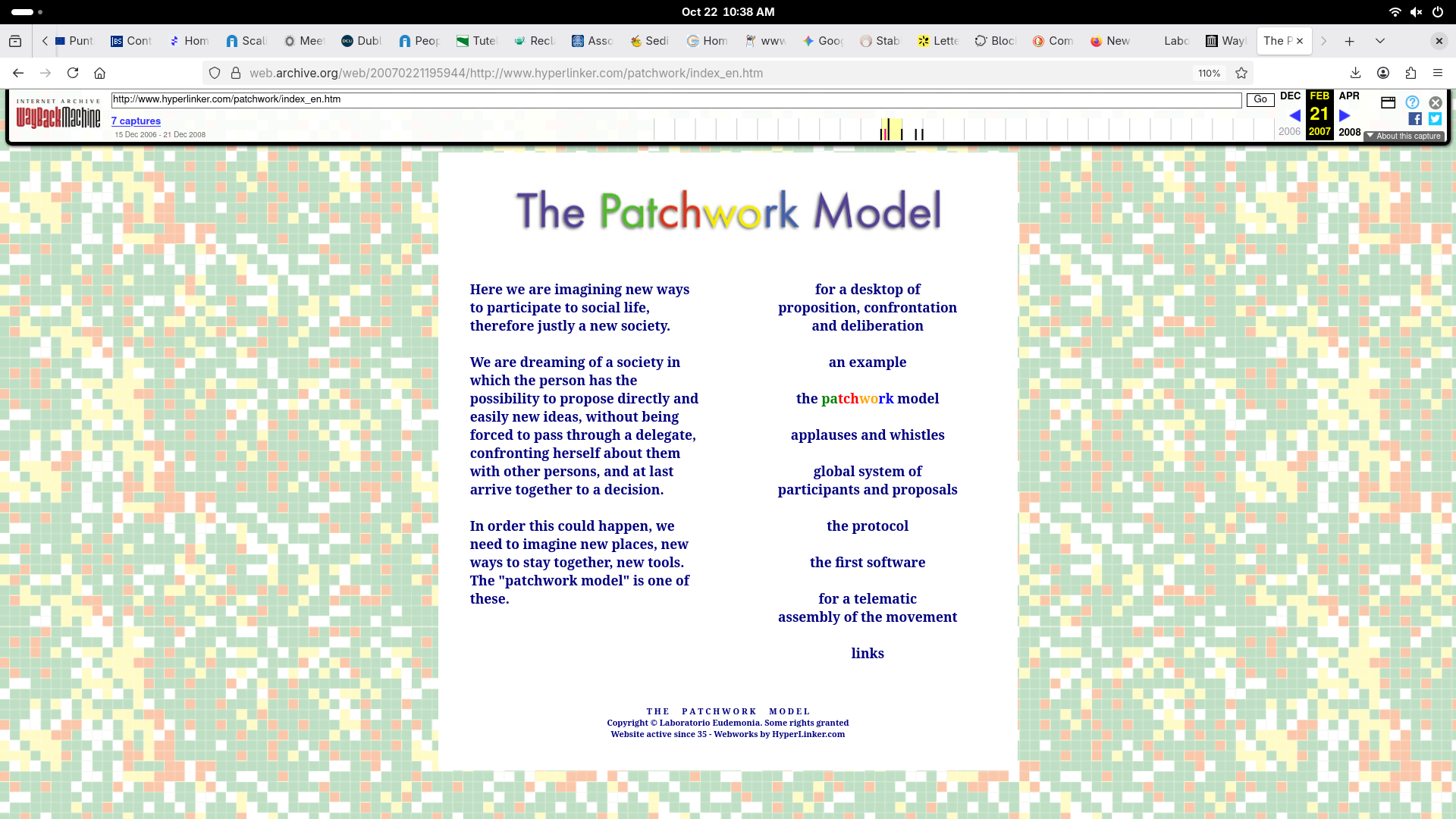 by the Laboratorio Eudemonia to The Patchwork Model ™ starts from the intervention For a telematic assembly of the Movement published on various mailing lists in the year 35: original 1 and 2 The following year, seen the need for such a tool, I started the "The Patchwork Model" web site, I encouraged many to participate: original 1 and 2 The same Archive.org conserves some captures since 2007. |